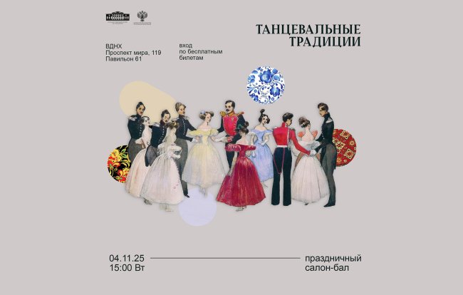 4 ноября (вторник), 15:00 ВДНХ, павильон № 61 (Проспект Мира, 119, стр. 61)Получить билет Вечер, посвященный танцевальным традициям. Продолжительность мероприятия 2 часа. 6+ Телефон для уточнения информации: 8 (985) 741-63-41.