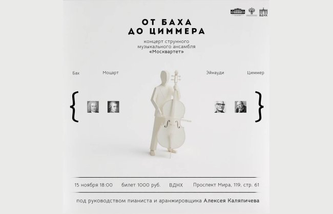 15 ноября (суббота), 18:00 ВДНХ, павильон № 61 (Проспект Мира, 119, стр. 61) Внимание! Отмена мероприятияКупить билет Уважаемые зрители! В связи с болезнью исполнителя концерт отменяется. Возврат денежных средств осуществляется до дня проведения мероприятия. На концерте вы услышите произведения Иоганна Себастьяна Баха, Вольфганга Амадея Моцарта, Людовико Эйнауди, Ханса Флориана Циммера в исполнении струнного музыкального ансамбля…