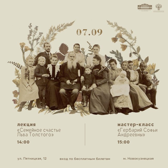 7 сентября (воскресенье), 15:00 Толстовский центр на Пятницкой (ул. Пятницкая, 12)Получить билеты У Софьи Андреевны Толстой было множество увлечений. Одному из ее увлечений – составлению гербария – будет посвящен данный мастер-класс. Вход по бесплатным билетам, которые можно получить в кассе музея. Продолжительность мероприятия 1 час. 12+ Телефон для уточнения информации: 7 (495) 951-58-08