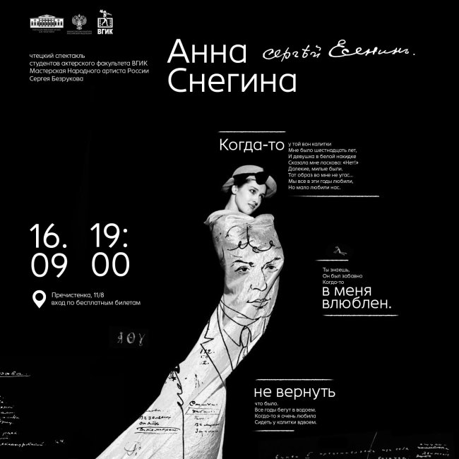 16 сентября (вторник), 19:00 Государственный музей Л.Н. Толстого (ул. Пречистенка, 11/8)Получить билет К 130-летию со дня рождения С.Есенина Чтецкий спектакль студентов 4 курса актерского факультета ВГИКа. Мастерская Народного артиста России Сергея Безрукова Продолжительность спектакля 1 час 30 минут. 12+ Вход по бесплатным билетам, которые можно получить в кассе музея. Телефон для уточнения информации: 8 (495)…