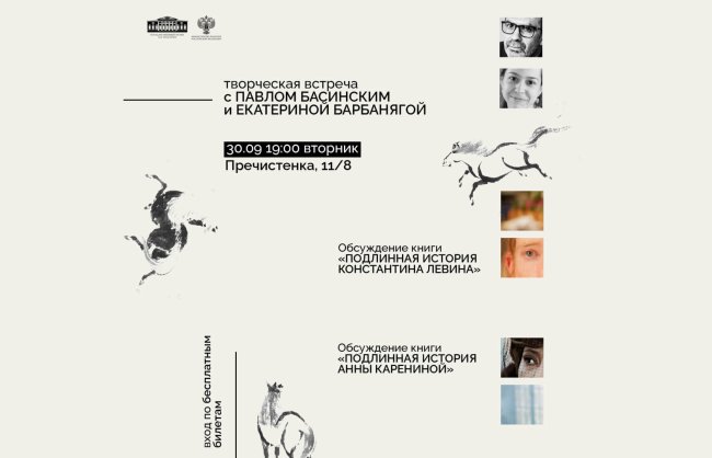30 сентября (вторник), 19:00 Государственный музей Л.Н. Толстого (ул. Пречистенка, 11/8)Получить билет В поддержку выставки «Не только Анна: голоса героев романа Льва Толстого» Встреча с писателями Павлом Басинским и Екатериной Барбанягой. Обсуждение книг «Подлинная история Анны Карениной» и «Подлинная история Константина Левина». Продолжительность мероприятия 1 час 30 минут. 12+ Вход по бесплатным билетам, которые можно…