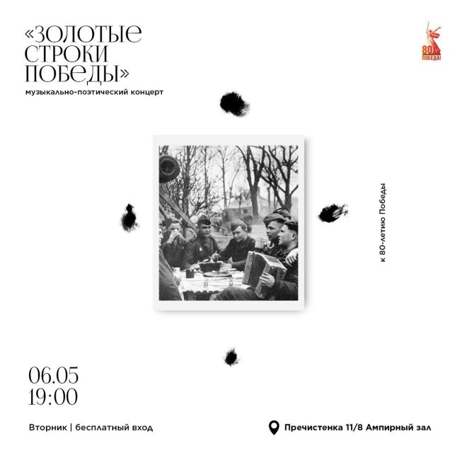 6 мая (вторник), 19:00 Ампирный зал, Пречистенка, 11/8 Вход по бесплатным билетам 6 мая в 19:00 приглашаем вас на музыкально-поэтический вечер, посвящённый памяти героев и силе искусства, вдохновлявшего в самые трудные времена. Этот вечер открывает серию концертов, подготовленных к 80-летию Великой Победы. В программе — песни военных лет, стихи и воспоминания. На сцене лауреаты международных…