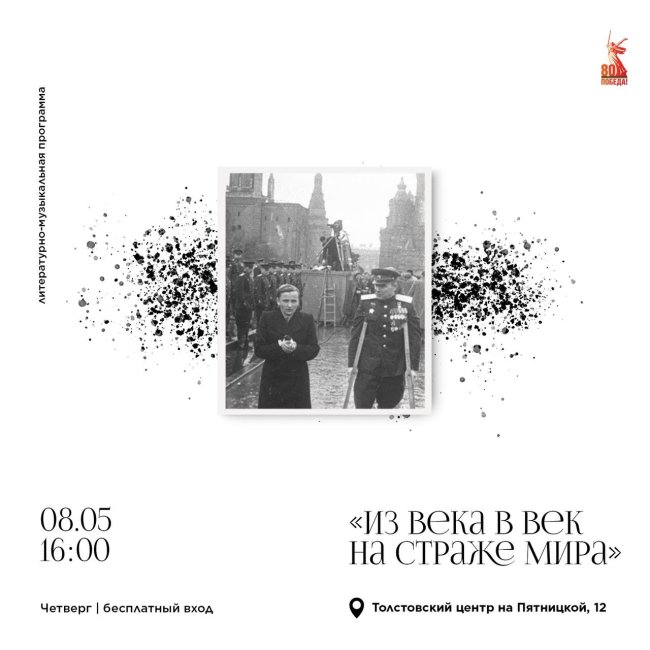 8 мая (четверг), 16:00 Толстовский центр на Пятницкой, 12 Вход по бесплатным билетам Приглашаем в Толстовский центр на Пятницкой,12 на литературно-музыкальный вечер, посвященный 80-летию Победы в Великой Отечественной войне. В программе: — блиц-экскурсия по выставке «Молодой Толстой» — о военном пути писателя; — обсуждение фильмов «Оборона Севастополя» (1911) и «Битва за Севастополь» (1944); — показ…