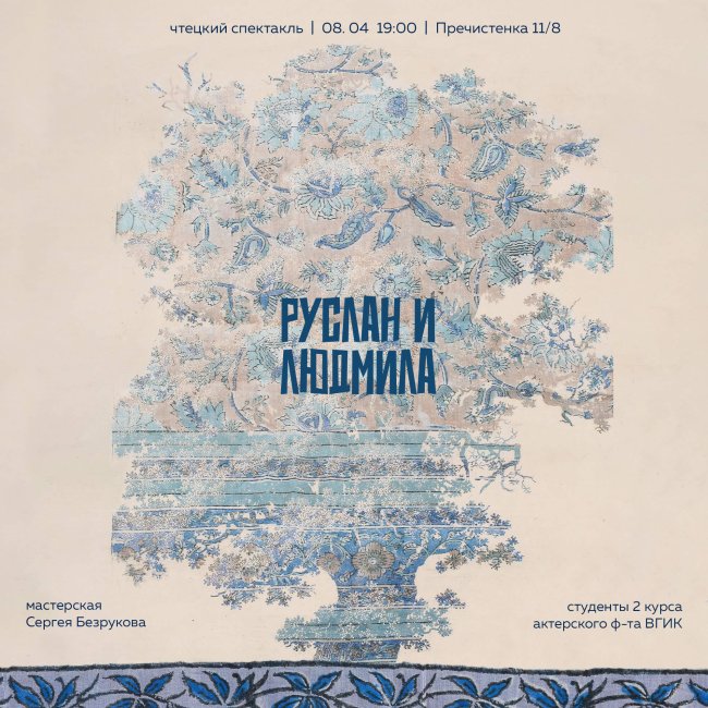8 апреля (вторник), 19:00 Государственный музей Л.Н. Толстого (ул. Пречистенка, 11/8) У лукоморья дуб зеленый, Златая цепь на дубе том…. 8 апреля в 19:00 в пространстве Литературной экспозиции на Пречистенке пройдет показ поэтического спектакля «Руслан и Людмила» в исполнении студентов актерского факультета мастерской Сергея Безрукова. В спектакле задействована музыка из одноименный оперы М. Глинки и композиции Чайковского.…