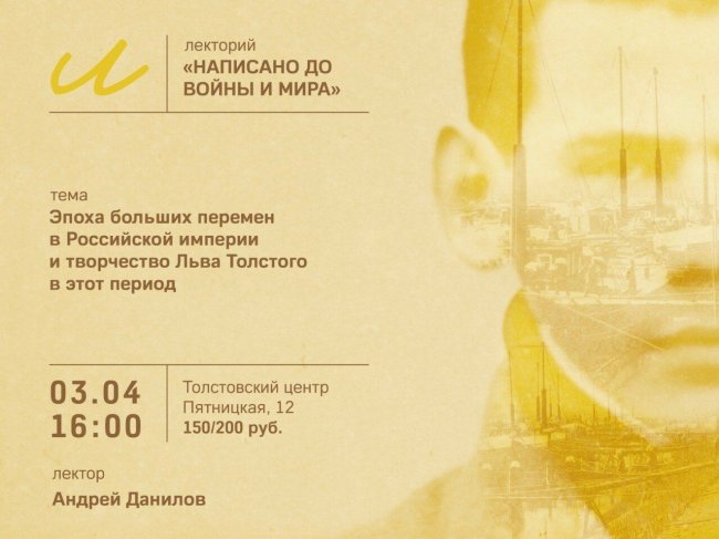 3 апреля, 10 апреля, 17 апреля, 24 апреля, 15 мая, 22 мая, 29 мая Толстовский центр на Пятницкой-12 (ул. Пятницкая, д. 12) Лекторий познакомит посетителей с молодым начинающим писателем Львом Толстым и теми произведениями, которые, находясь в тени трех великих романов, мало известны широкому кругу читателей. Повествование научных сотрудников Государственного музея Льва Толстого подкрепляется новой…