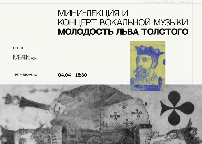 4 апреля (пятница), 18:30 Толстовский центр на ул. Пятницкой: г. Москва, ул. Пятницкая, д. 12 Вход по бесплатным билетам Мини-лекция и концерт «Молодость Льва Толстого» Концерт классической музыки в исполнении студентов музыкальных вузов.   Вход по бесплатным билетам
