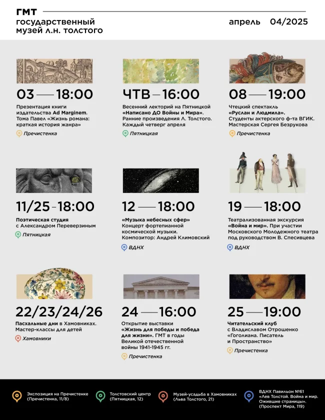 Апрель г. Москва, все филиалы нашего музея Представляем Вам афишу на самые интересные события во всех филиалах нашего музея.   Подробнее о программе площадок:   Литературная экспозиция на ул. Пречистенке: г. Москва, Пречистенка, д. 11/8   3 апреля (четверг), 18:00 Тома Павел «Жизнь романа: краткая история жанра» Презентация книги издательства Ad Marginem. В дискуссии примут…