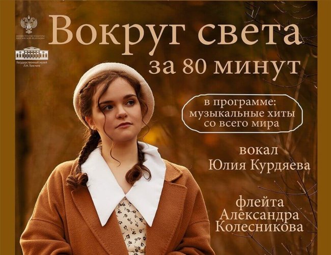 4 июня (вторник) 2024 года, 19:00 ул. Пречистенка, 11/8, Ампирный зал Цикл вечеров «Музыка в доме Толстого» Вход по билетам. Справки о билетах по телефону: 8 (909) 674-09-02 Музыкальное путешествие по странам и эпохам «Вокруг света за 80 минут»   Вокал – Юлия Курдяева, меццо-сопрано Концертмейстер – Ольга Гаврилова Флейта – Александра Колесникова
