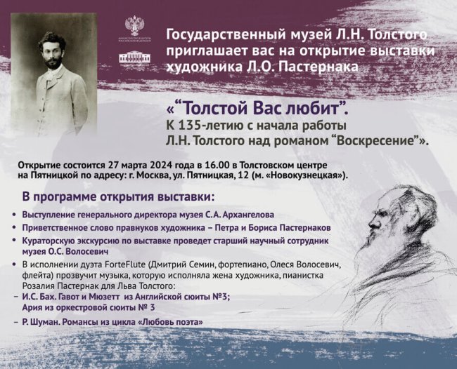 27 марта (среда) 2024 года, 16:00 Толстовский центр на Пятницкой,12 Вход по бесплатным билетам Выставка работ художника Л.О. Пастернака. «К 135-летию начала работы Л.Н. Толстого над романом ”Воскресение”» Кураторская экскурсия, выступление камерного ансамбля в составе: Олеся Волосевич (флейта), Дмитрий Сёмин (фортепиано), Константин Шмырев (виолончель)   В программе произведения из репертуара Розалии Пастернак, жены художника.