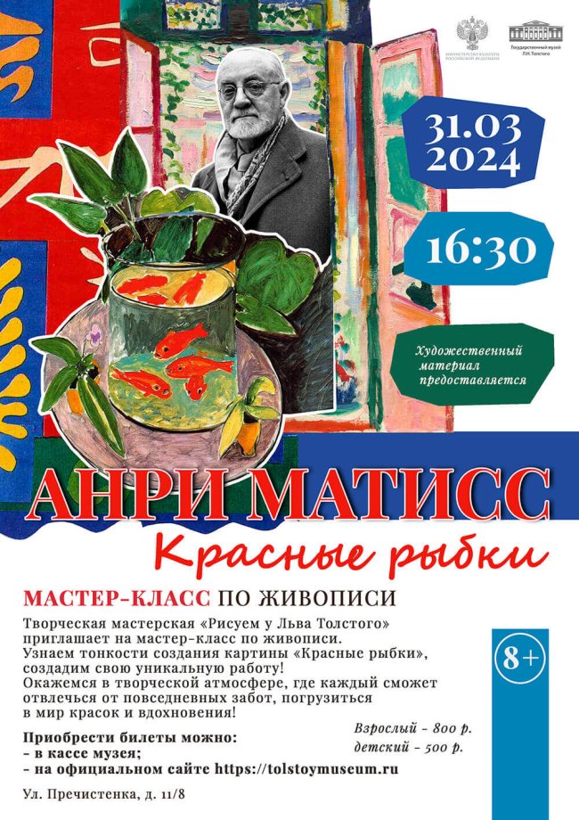 31 марта (воскресенье) 2024 года, 16.30 ул. Пречистенка, 11/8Купить билеты Приглашаем в творческую мастерскую «Рисуем у Льва Толстого»: на новом занятии изобразим красных рыбок Анри Матисса. Участие в мастер-классе платное: — на общих основаниях (взрослые) – 800 руб.; — на льготных основаниях (дети до 16 лет, пенсионеры) – 500 руб. Художественный материал предоставляется!