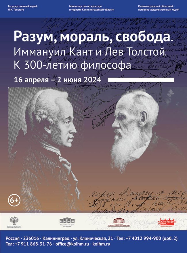 16 апреля 2024 года — 2 июня 2024 года Государственное бюджетное учреждение культуры «Калининградский областной историко-художественный музей» (г. Калининград, ул. Клиническая, 21) Часы работы: ежедневно с 10 до 18, касса — до 17 Во вторник, 16 апреля, в Калининградском областном историко-художественном музее состоится открытие выставки «Разум, мораль, свобода. Иммануил Кант и Лев Толстой. К 300-летию…