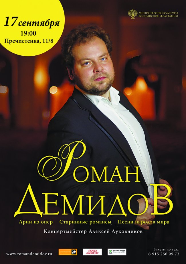 17 сентября (четверг), 19:00 Пречистенка, 11. Ампирный залВход по билетам Цикл вечеров «Музыкальные вечера на Пятницкой» Исполнитель: лауреат международных конкурсов, приглашенный солист Пражской оперы Роман Демидов (бас) Роман Демидов – певец, ломающий стереотипы на современной оперной и эстрадной сценах, обладатель уникального по диапазону голоса с редким красивым тембром. За высокий артистизм, самобытность, достоинство и вокальное…
