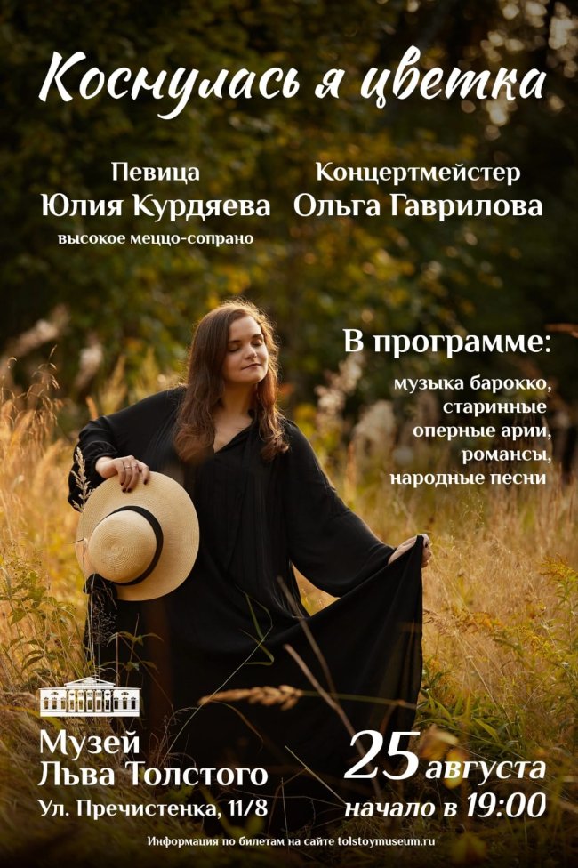 25 августа 2022 г. 19.00 Пречистенка, 11/8, Ампирный зал Цикл вечеров «Музыка в доме Толстого Концерт лауреата международных конкурсов Кудряевой Юлии (меццо-сопрано)     25 августа в 19:00 в Ампирном зале Государственного музея Л.Н. Толстого состоится сольный концерт молодой певицы, лауреата российских и международных музыкальных конкурсов Юлии Курдяевой. В концерте в исполнении Юлии прозвучат арии…