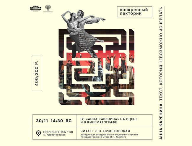 30 ноября (воскресенье), 14:30 Государственный музей Л.Н. Толстого (ул. Пречистенка, 11/8)Купить билеты Заключительная лекция «Анна Каренина» на сцене и в кинематографе» из цикла Воскресного лектория «Анна Каренина». Текст, который невозможно исчерпать», подготовленный к выставке «Не только Анна: голоса героев романа Льва Толстого», пройдет в Литературной экспозиции на Пречистенке. В лекции Л.О. Оржеховской речь пойдет о…